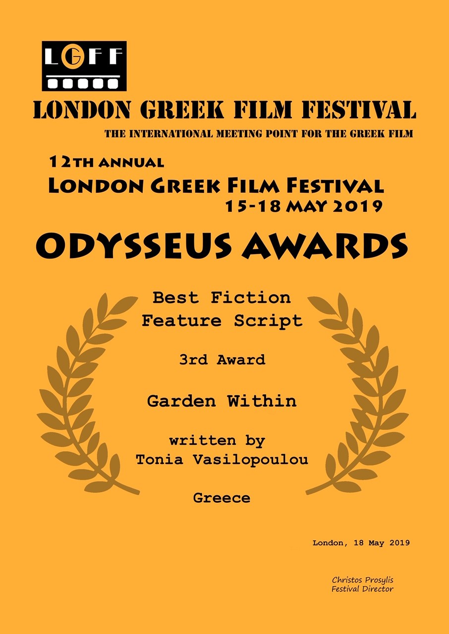 I was so happy to win the Odysseus Award for my fiction feature script ‘Garden Within’ at the London Greek Film Festival in 2019!